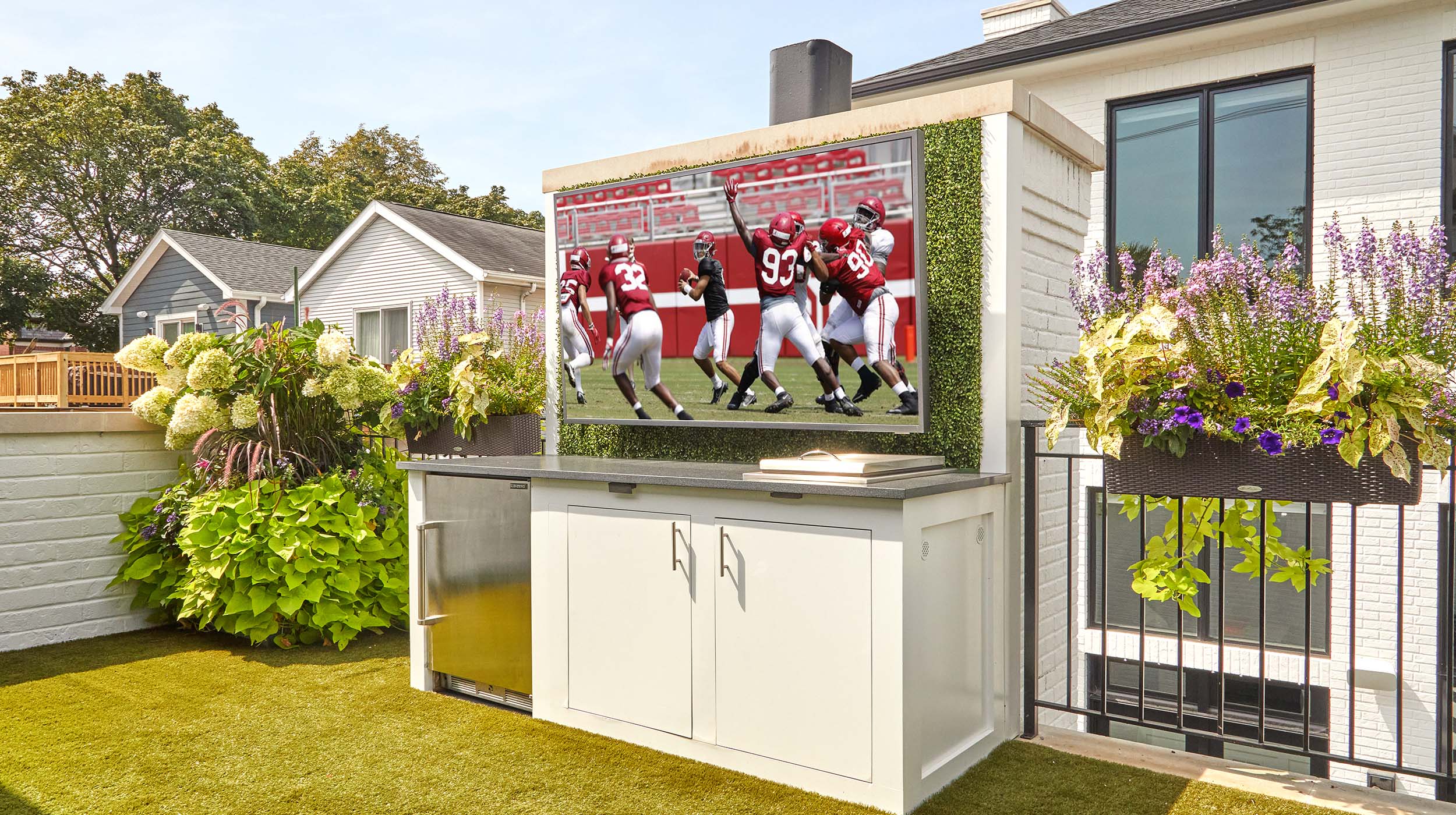 Custom-fabricated shade structure providing coverage over the main seating and entertainment area.
